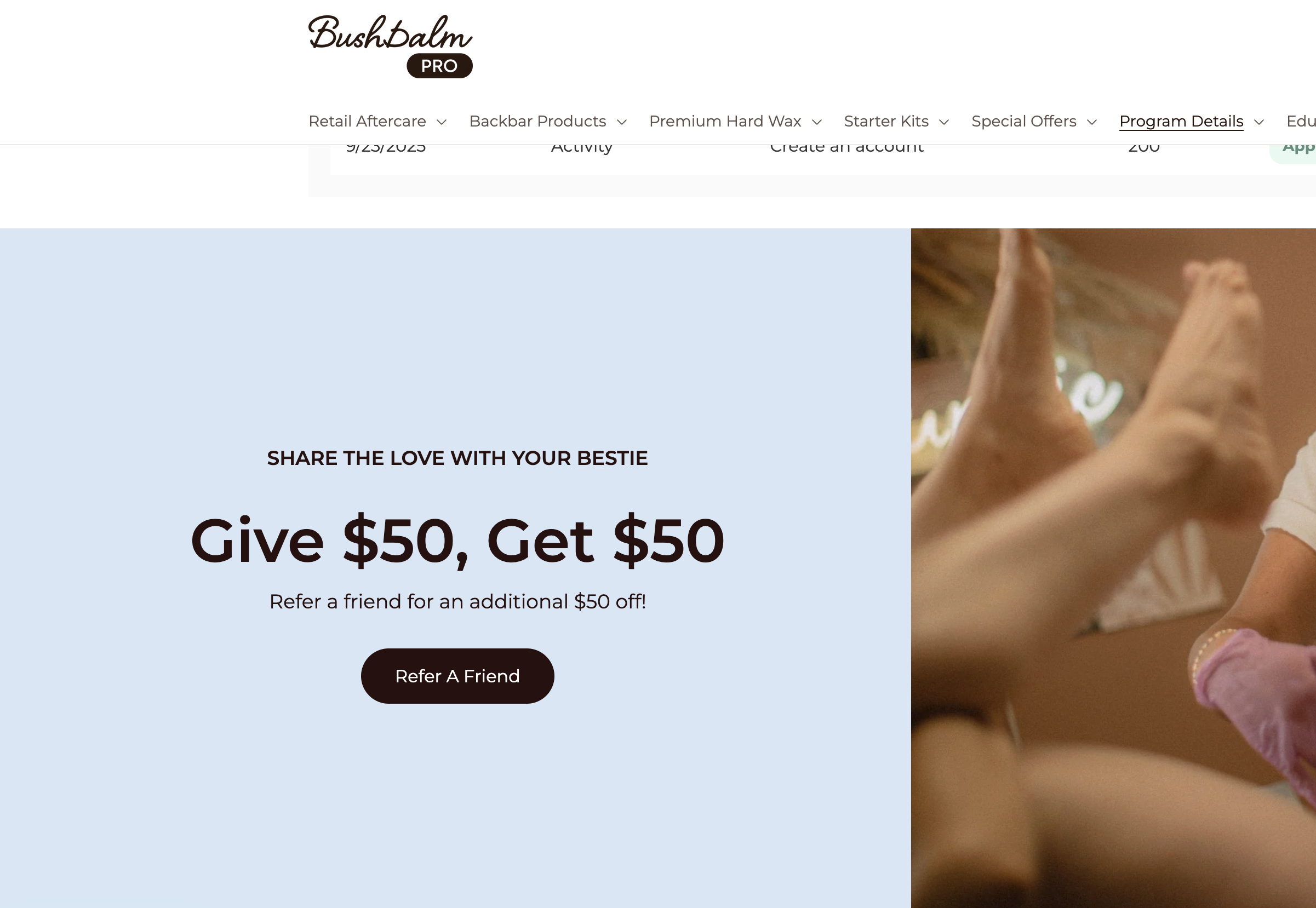 Share your referral link with a friend, and they’ll get $50 USD ($69.49 CAD) off their first purchase of $200 USD ($277.96 CAD) or more. Once they complete a qualifying order, you’ll earn 1,000 Club Bare points.